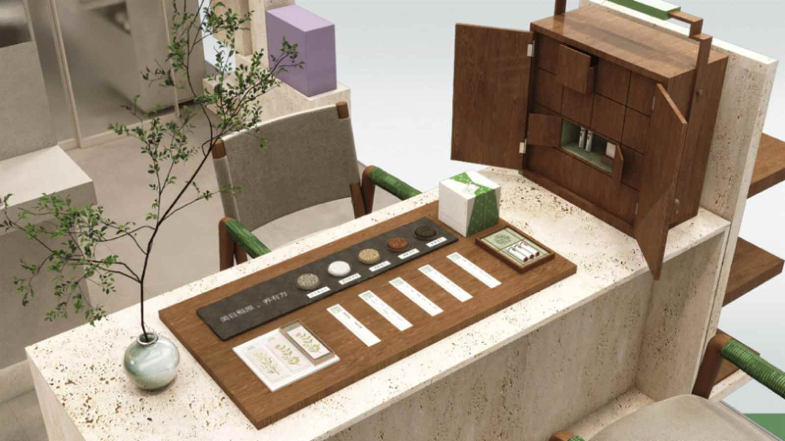 灯光与材质上,翠光玻璃与原木的搭配营造温润通透的气氛,光影方针模仿天然光感,照应“道法天然”的玄学。柜台团体以低饱和度颜色为主,部分以青黛、赭石等古代色粉饰,变成安静而有性命力的空间韵律。